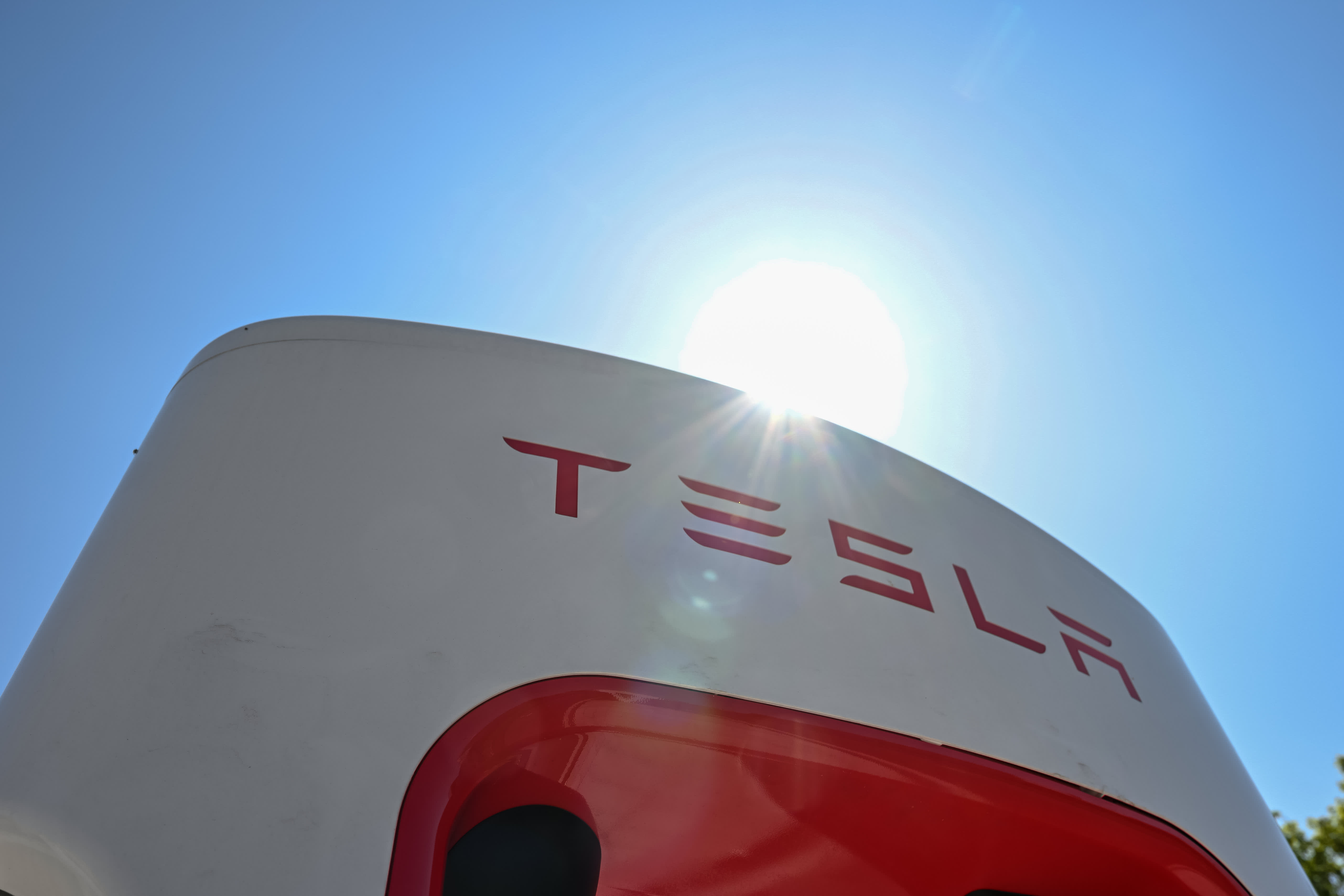 TESLA logo on a charging station at on May 26, 2023 in Merklingen, Germany. Harry Langer/…
