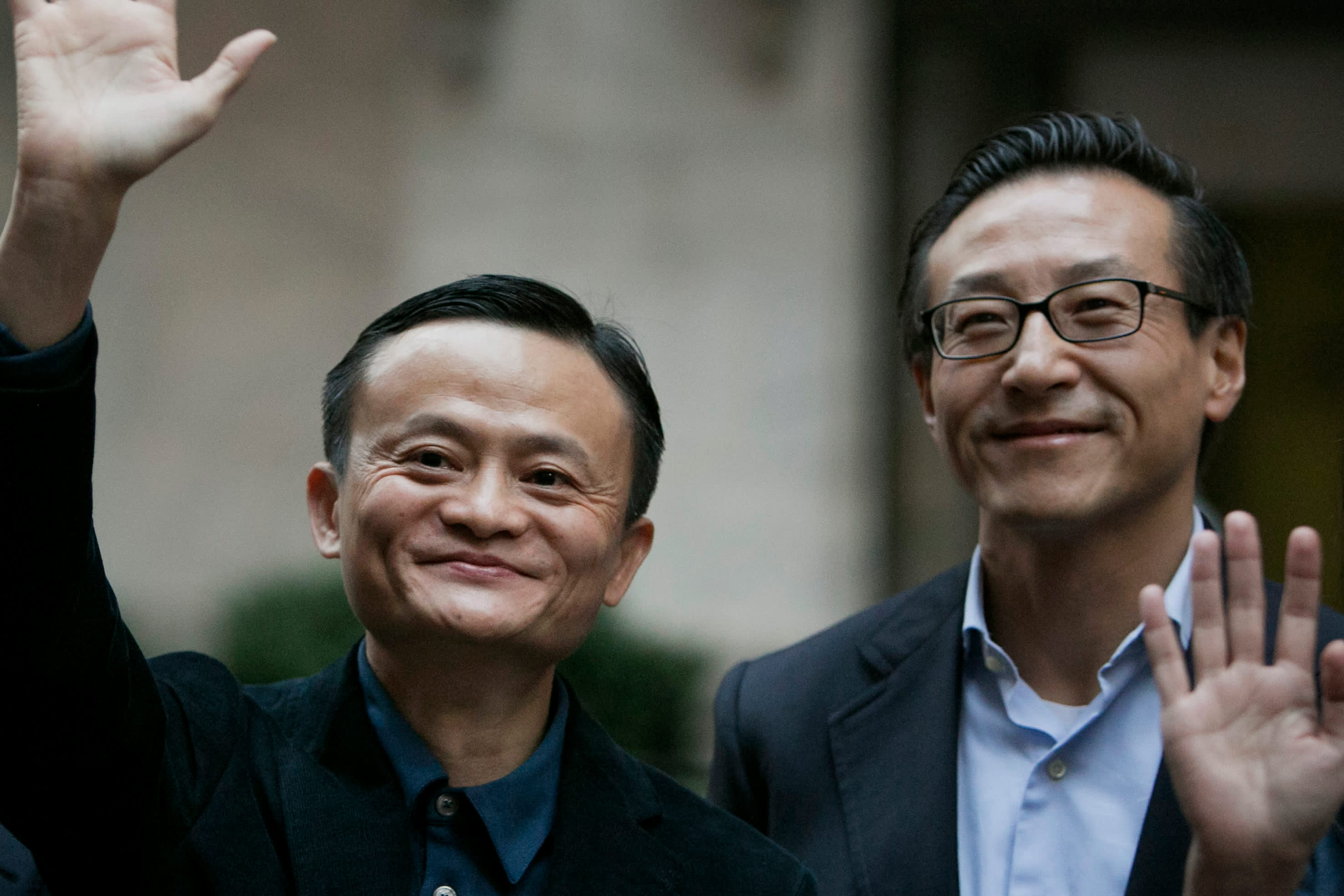 Alibaba co-founders Jack Ma and chairman Joe Tsai, in front of the New York Stock…