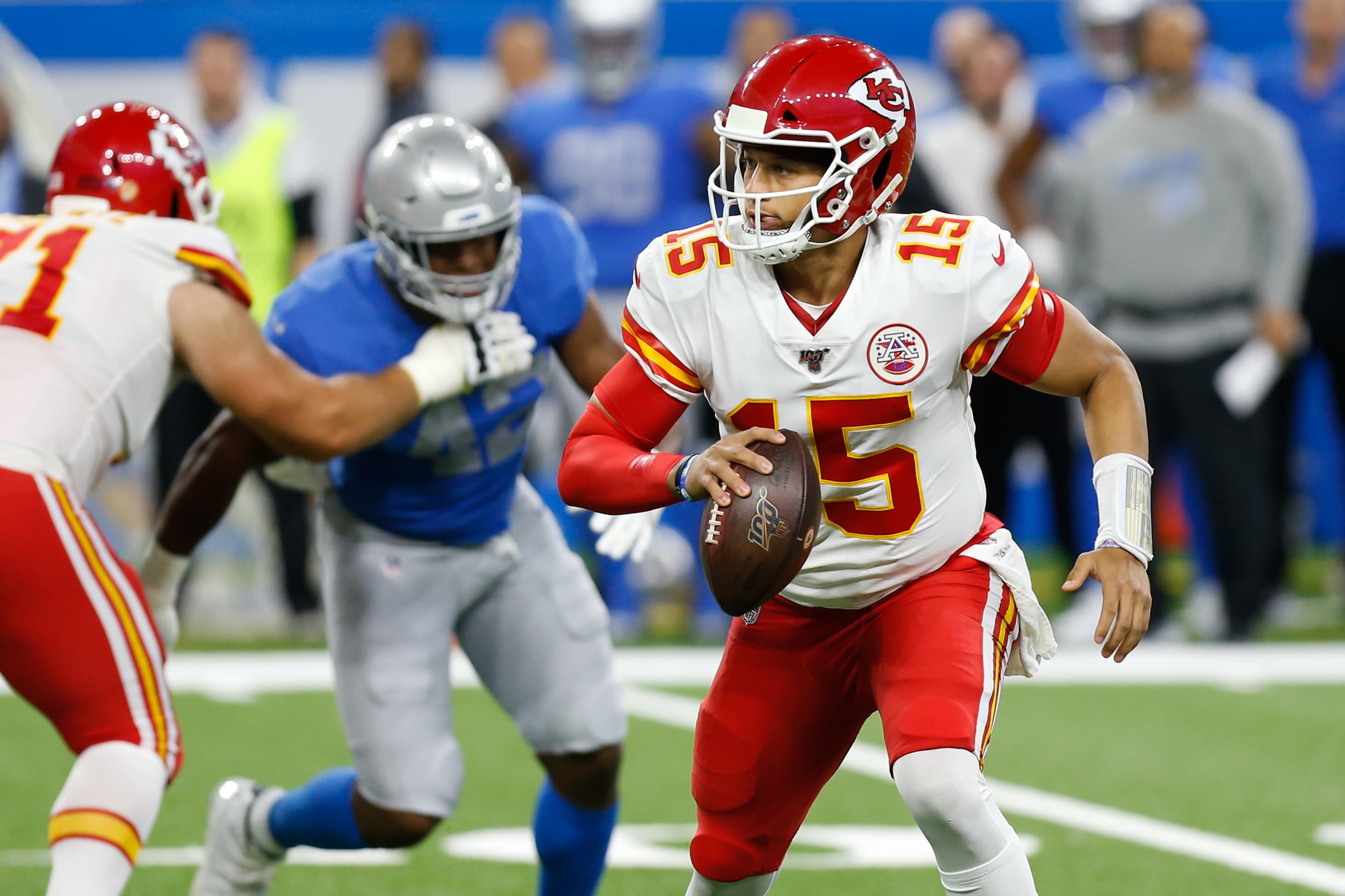 DETROIT, MI - SEPTEMBER 29: Kansas City Chiefs quarterback Patrick Mahomes (15) runs with the…