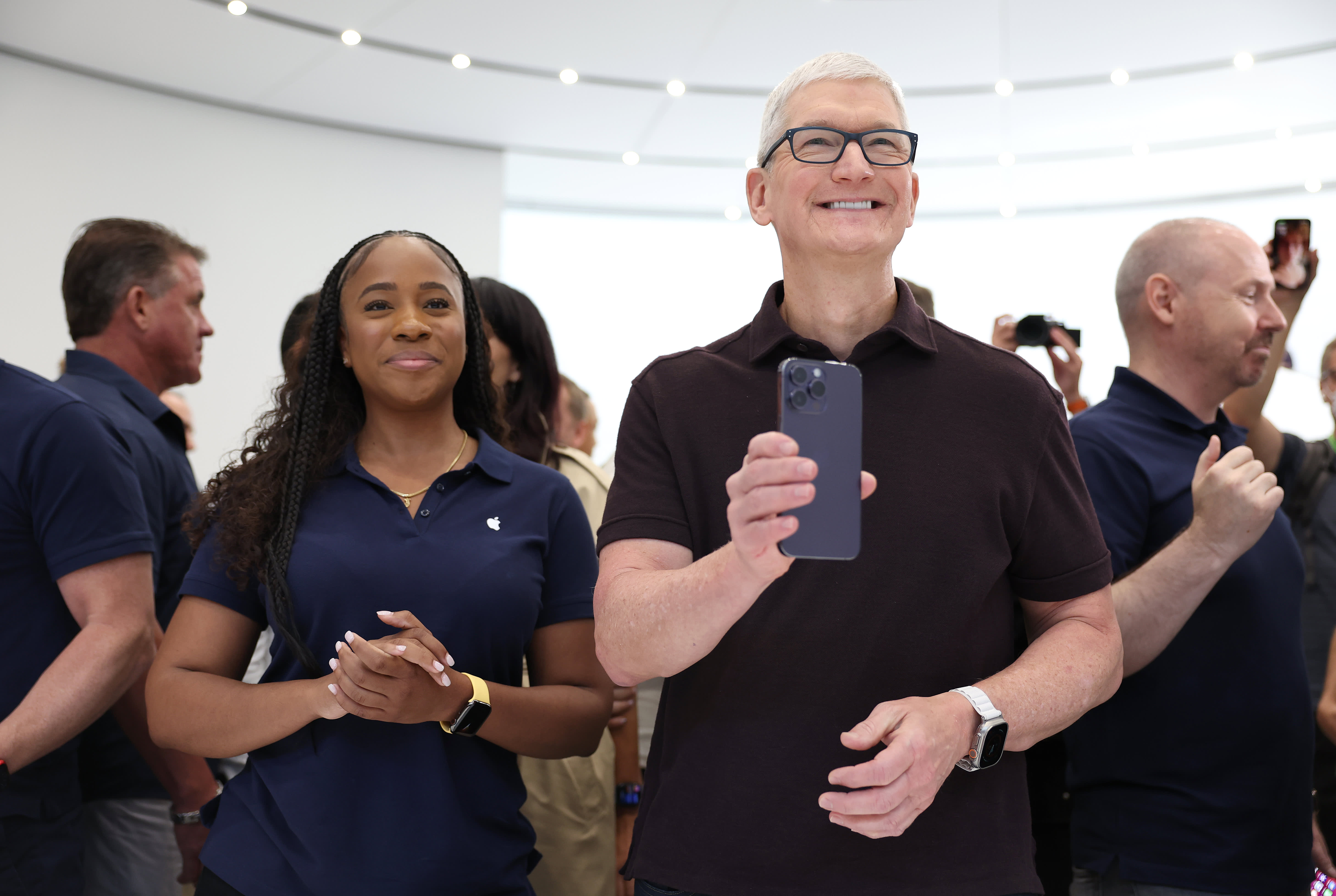 Apple CEO Tim Cook holds a new iPhone 14 Pro during an Apple special event…